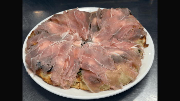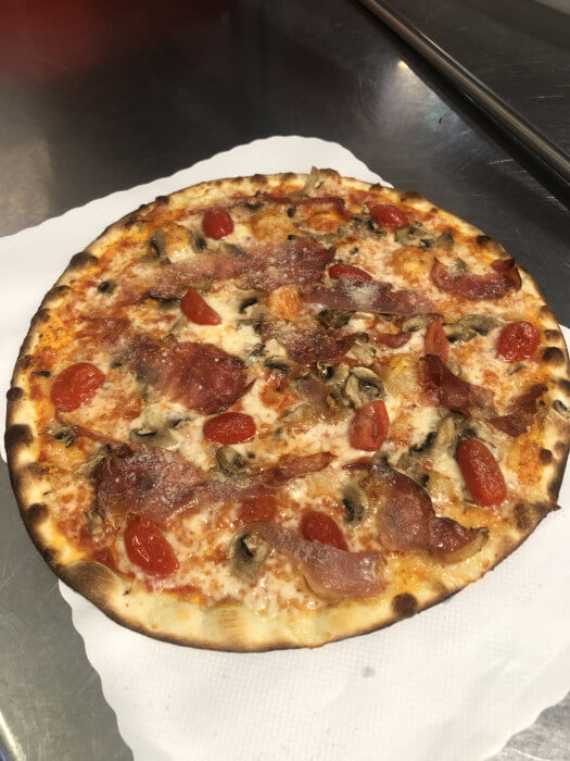 Tomato Sauce, Mozzarella Cheese, Speck, Fresh Mushroom, Grape Tomatoes, Parmesan Cheese
