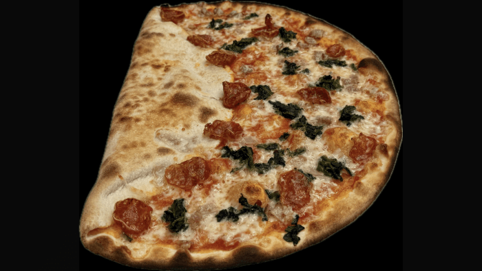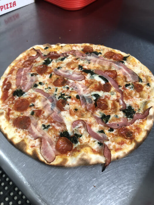 Tomato Sauce, Mozzarella Cheese, Spicy Salami, Pancetta, Sautéed Spinach, Gorgonzola Cheese