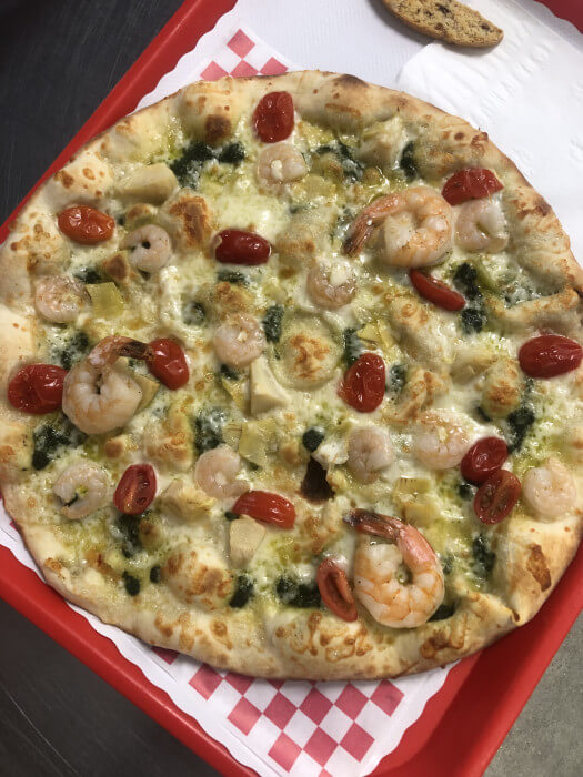 Mozzarella Cheese, Shrimps, Artichokes, Grape Tomatoes, Pesto Sauce